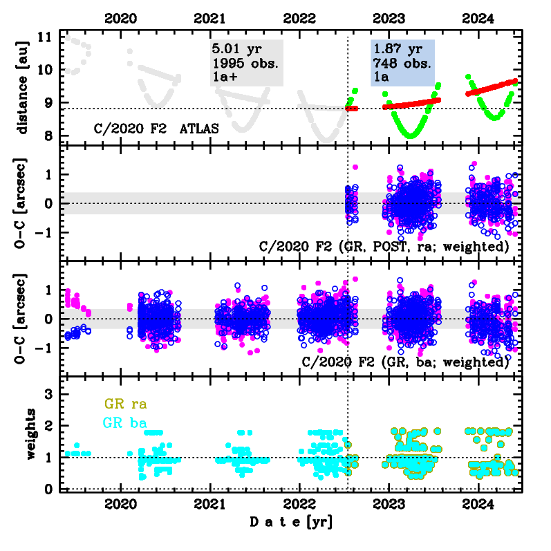 Comet C/2020 F2 was discovered on 21 March 2020, more than three years before its perihelion passage. Later a series of pre-discovery observations were found going back to 27 May 2019 (heliocentric disctance: 10.96 au). This comet was observed until 30 May 2024 (as in February 2025).