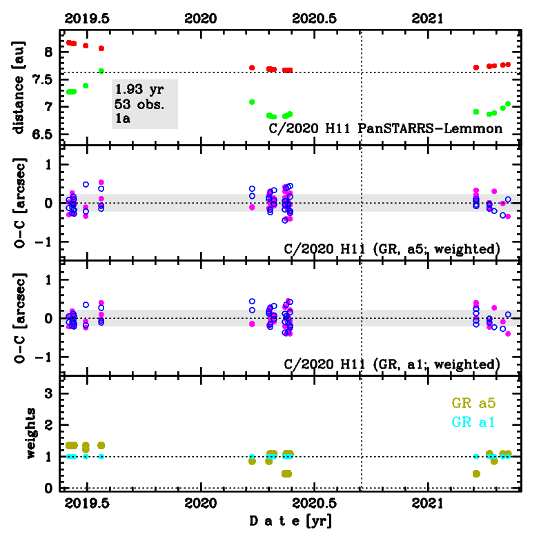 The preferred GR solution given here is based on data span over 1.93 yr in a range of heliocentric distances: 8.17 au – 7.63 au (perihelion) – 7.77 au.