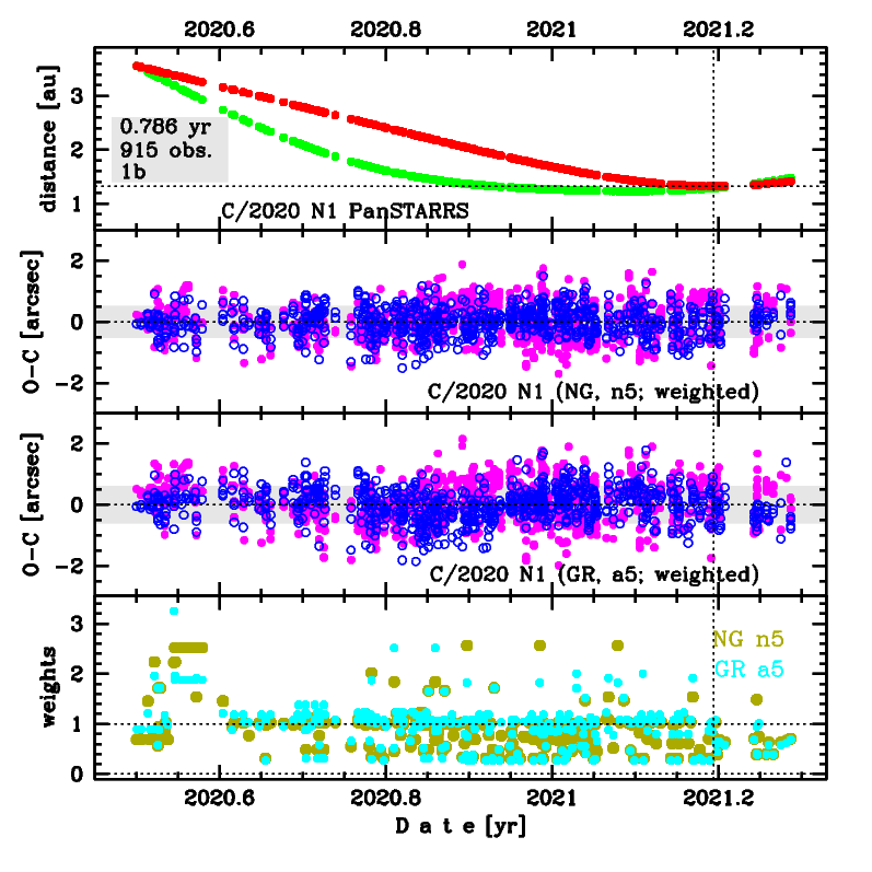 Comet C/2020 N1 was discovered on 3 July 2020, about 8.5 months before its perihelion passage, later a single pre-discovery observation was found from 1 July 2020. This comet was observed to 14 April 2021.