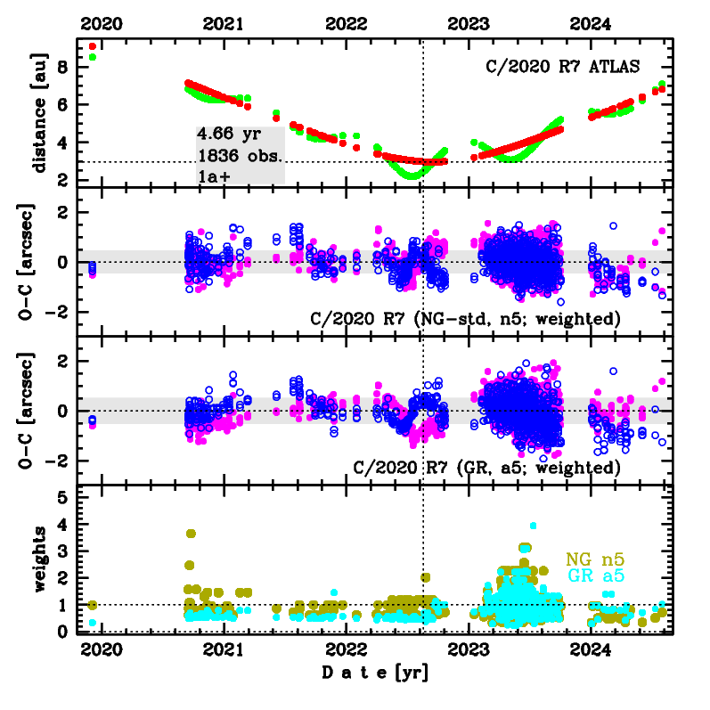 Currently, the preferred NG solution given here is based on data span over 4.66 yr in a range of heliocentric distances: 9.08 au – 2.96 au (perihelion) – 6.81 au. This comet shows large trends in the O-C distribution for a purely gravitational orbit. However, still some trends in [O-C] are visible for NG solutions based on full data arc (see solution 'c5' or 'n5'), trends substantially decrease for NG orbit based on pre-perihelion data atc (solution 'pc').