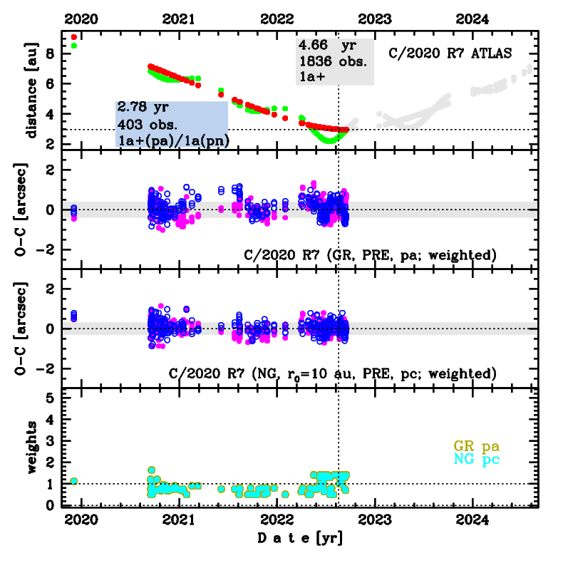 Currently, the preferred NG solution given here is based on data span over 4.66 yr in a range of heliocentric distances: 9.08 au – 2.96 au (perihelion) – 6.81 au. This comet shows large trends in the O-C distribution for a purely gravitational orbit. However, still some trends in [O-C] are visible for NG solutions based on full data arc (see solution 'c5' or 'n5'), trends substantially decrease for NG orbit based on pre-perihelion data atc (solution 'pc').