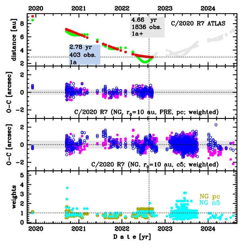 Currently, the preferred NG solution given here is based on data span over 4.66 yr in a range of heliocentric distances: 9.08 au – 2.96 au (perihelion) – 6.81 au. This comet shows large trends in the O-C distribution for a purely gravitational orbit. However, still some trends in [O-C] are visible for NG solutions based on full data arc (see solution 'c5' or 'n5'), trends substantially decrease for NG orbit based on pre-perihelion data atc (solution 'pc').