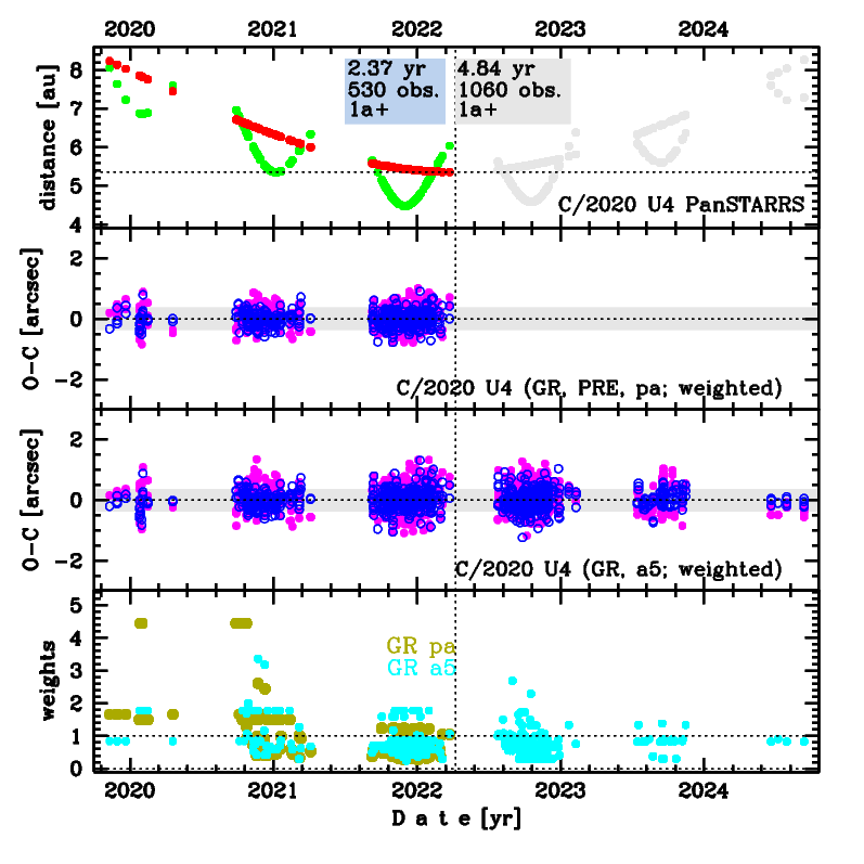 Comet C/2020 U4 was discovered on 22 October 2020, about 1.5 yr before its perihelion passage; later a series of prediscovery images was found going back to 9 November 2019. This comet was observed until 11 September 2024 (as in February 2025).