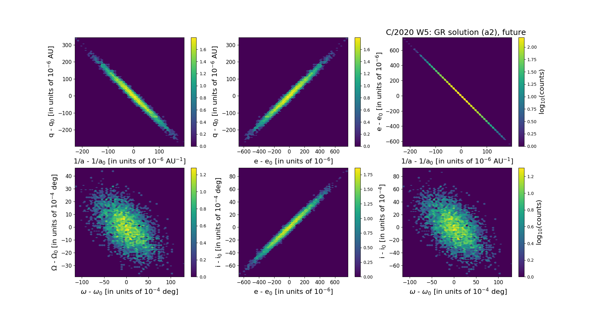 The preferred GR solution given here is based on data span over 0.192 yr in a very narrow range of heliocentric distances: 3.38 au – 3.36 au (perihelion) – 3.38 au. Due to short data arc uncertainties of orbital elements are relatively large (orbit of 2b quality class).