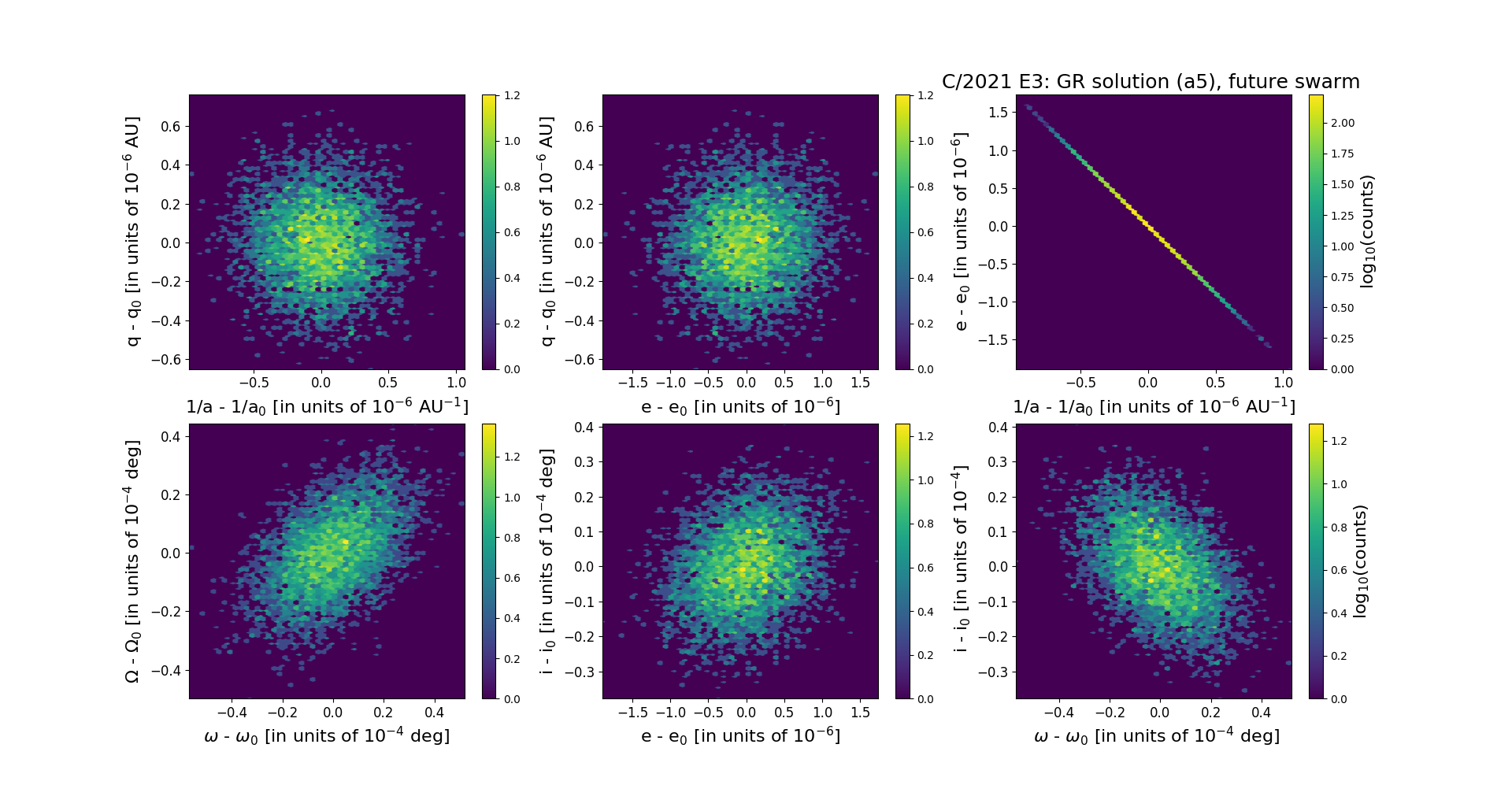 This comet shows visible trends in the O-C distribution for a GR orbit; see [O-C] diagram for solution 'a5'. The preferred NG solution given here ('nt') is based on data span over 2.85 yr in a range of heliocentric distances: 5.34 au – 1.777 au (perihelion) – 6.35 au.