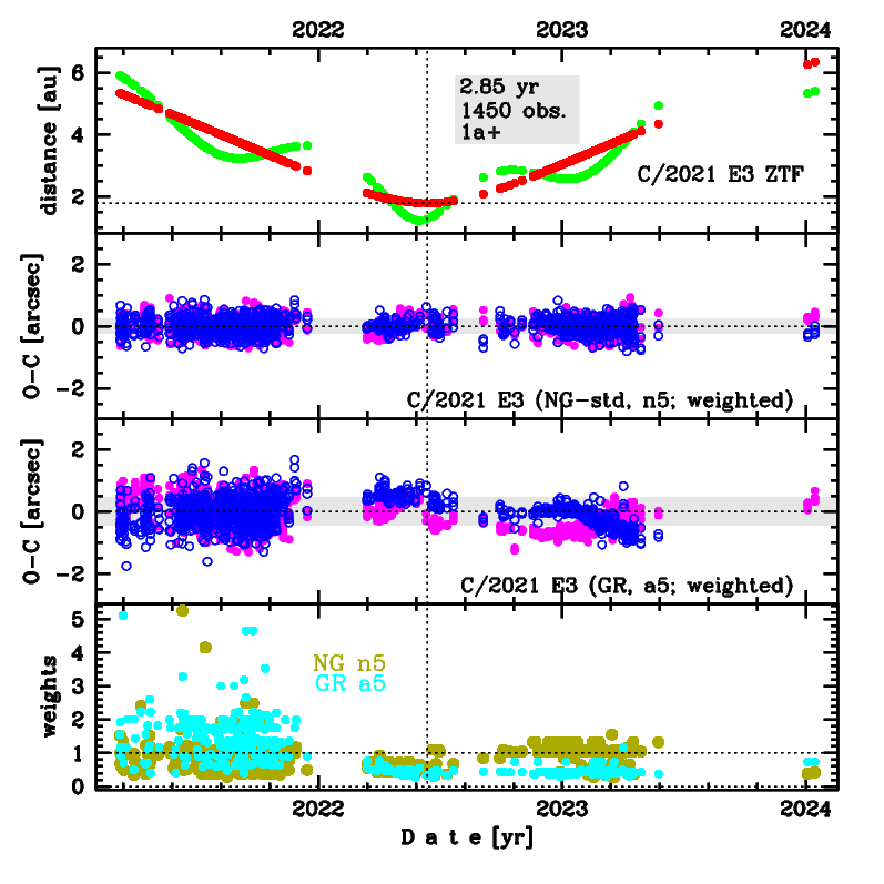 This comet shows visible trends in the O-C distribution for a GR orbit; see [O-C] diagram for solution 'a5'. The preferred NG solution given here ('nt') is based on data span over 2.85 yr in a range of heliocentric distances: 5.34 au – 1.777 au (perihelion) – 6.35 au.