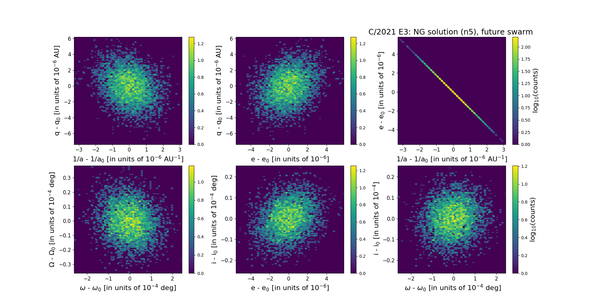 This comet shows visible trends in the O-C distribution for a GR orbit; see [O-C] diagram for solution 'a5'. The preferred NG solution given here ('nt') is based on data span over 2.85 yr in a range of heliocentric distances: 5.34 au – 1.777 au (perihelion) – 6.35 au.