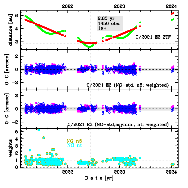 This comet shows visible trends in the O-C distribution for a GR orbit; see [O-C] diagram for solution 'a5'. The preferred NG solution given here ('nt') is based on data span over 2.85 yr in a range of heliocentric distances: 5.34 au – 1.777 au (perihelion) – 6.35 au.