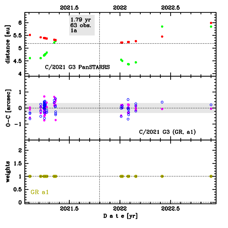 GR solution given here is based on data span over 1.79 yr in a range of heliocentric distances: 5.52 au – 5.18 au (perihelion) – 5.99 au.