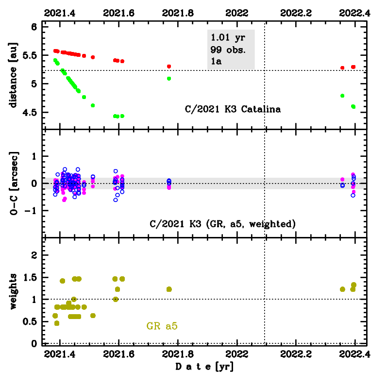Comet had its closest approach to the Earth on 28 June 2022 (4.36 au), almost four months after its perihelion passage. However, before perihelion passage this comet was at similar distance from the Earth (4.43 au) on 5 August 2021 (six months before perihelion).