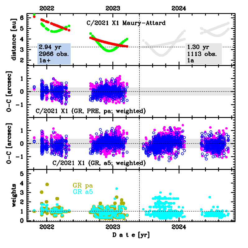 The preferred GR solution given here is based on data span over 6.09 yr in a range of heliocentric distances: 6.06 au – 3.23 au (perihelion) – 5.49 au. Some trends in [O-C] diagram are visible for GR orbit; however, NG solution based on the entire data arc results in negative radial NG parameter A1, so this solution is not given here.