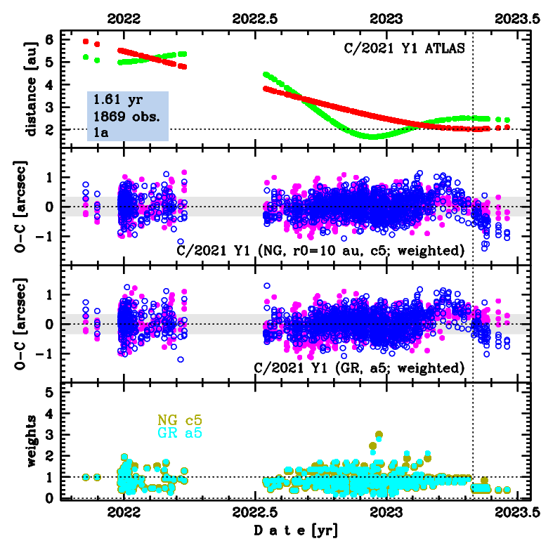 The preferred NG solution given here is based on data span over 1.61 yr in a range of heliocentric distances: 5.91 au – 2.032 au (perihelion) – 2.11 au. However, even this NG solution exhibits some trends in [O-C] within a few months before perihelion passage. Thus, we also offer the solution 'd5' for past orbital study.