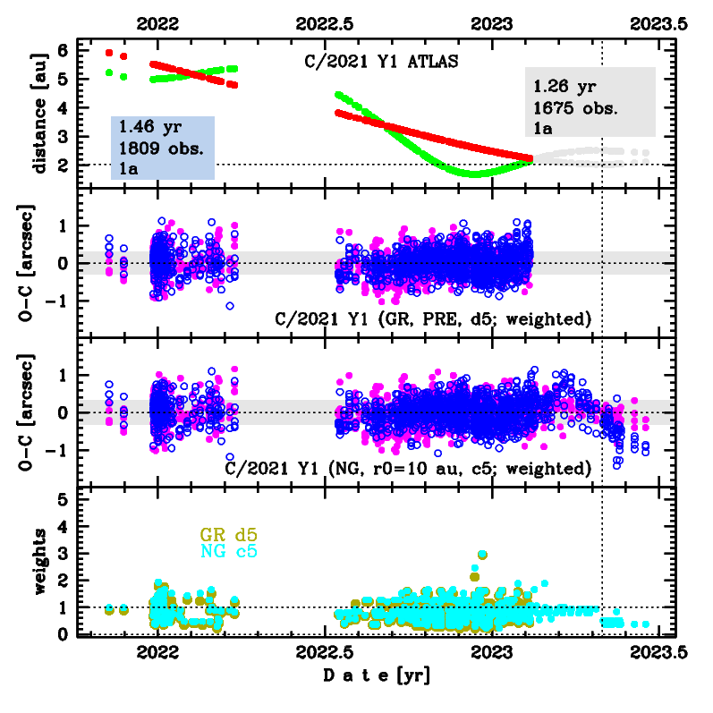 The preferred NG solution given here is based on data span over 1.61 yr in a range of heliocentric distances: 5.91 au – 2.032 au (perihelion) – 2.11 au. However, even this NG solution exhibits some trends in [O-C] within a few months before perihelion passage. Thus, we also offer the solution 'd5' for past orbital study.