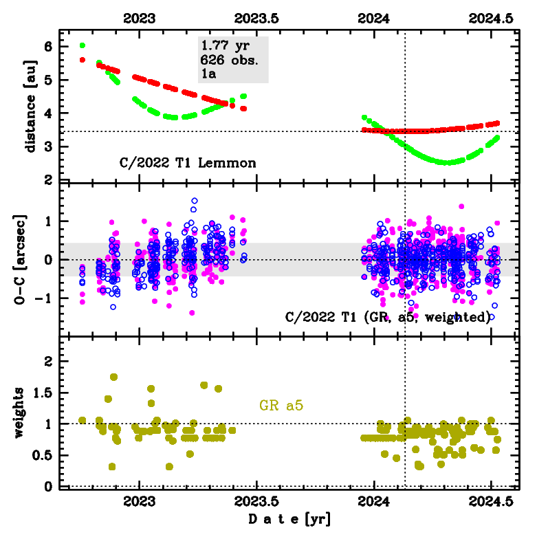 GR solution given here is based on data span over 1.77 yr in a range of heliocentric distances: 5.60 au – 3.44 au (perihelion) – 3.69 au.